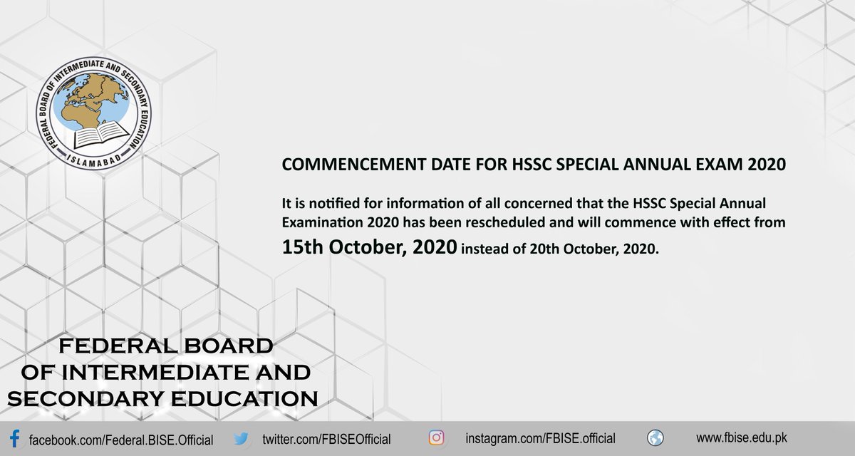 Fbise Official On Twitter Commencement Date For Hssc Special Annual Exam 2020 It Is Notified For Information Of All Concerned That The Hssc Special Annual Examination 2020 Has Been Rescheduled And Will